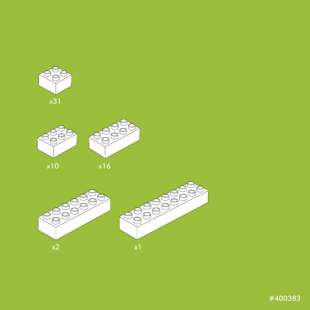 - 60 Teile (31 2x2er Bausteine, 10 2x3er Bausteine, 16 2x4er Bausteine, 2 2x6er Bausteine und 1 2x8er Baustein)