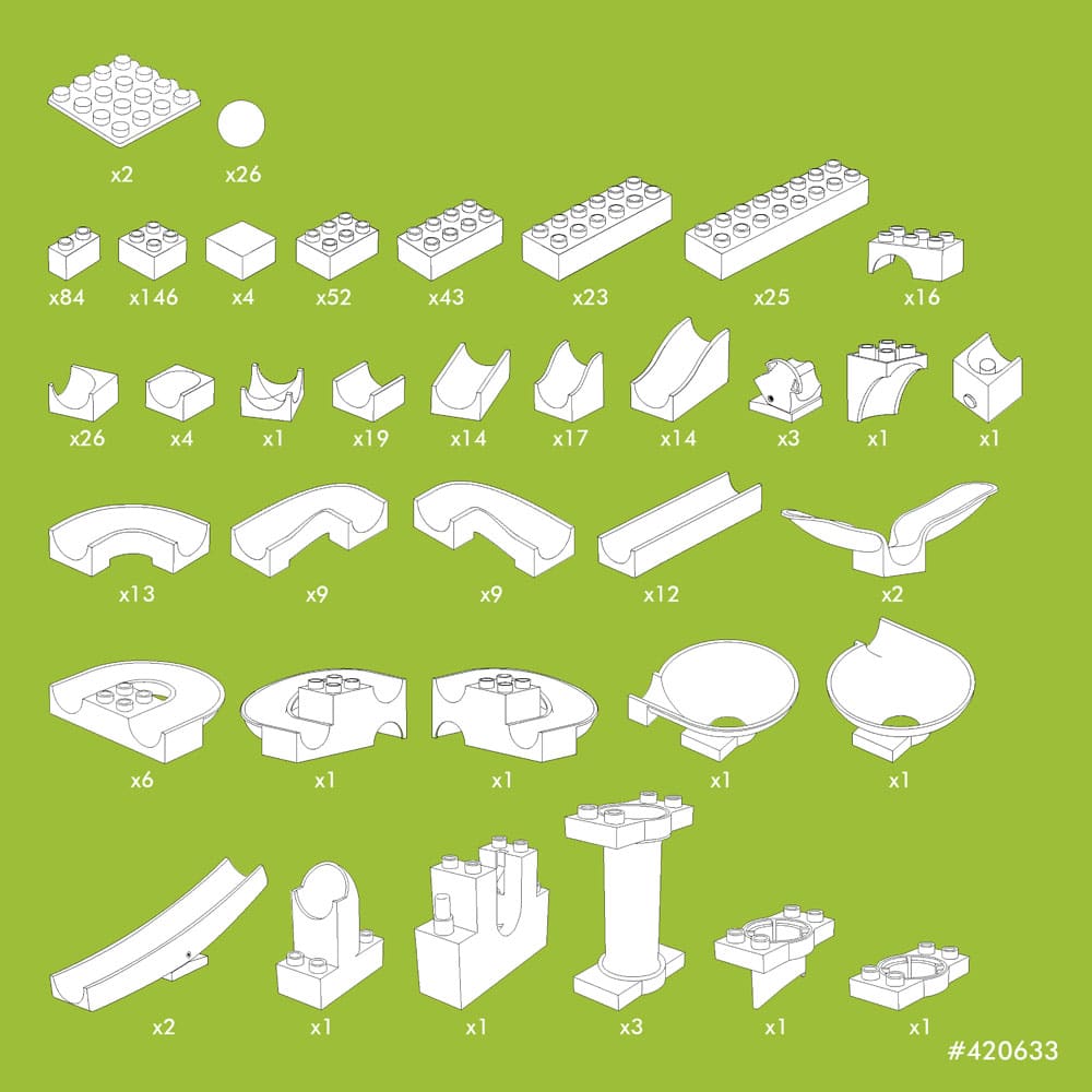 - 585 Teile (162 Bahnelemente, 377 Konstruktionsbausteine, 18 Sonderbauteile, 2 Grundplatten, 26 Kugeln) + Anleitungsbuch