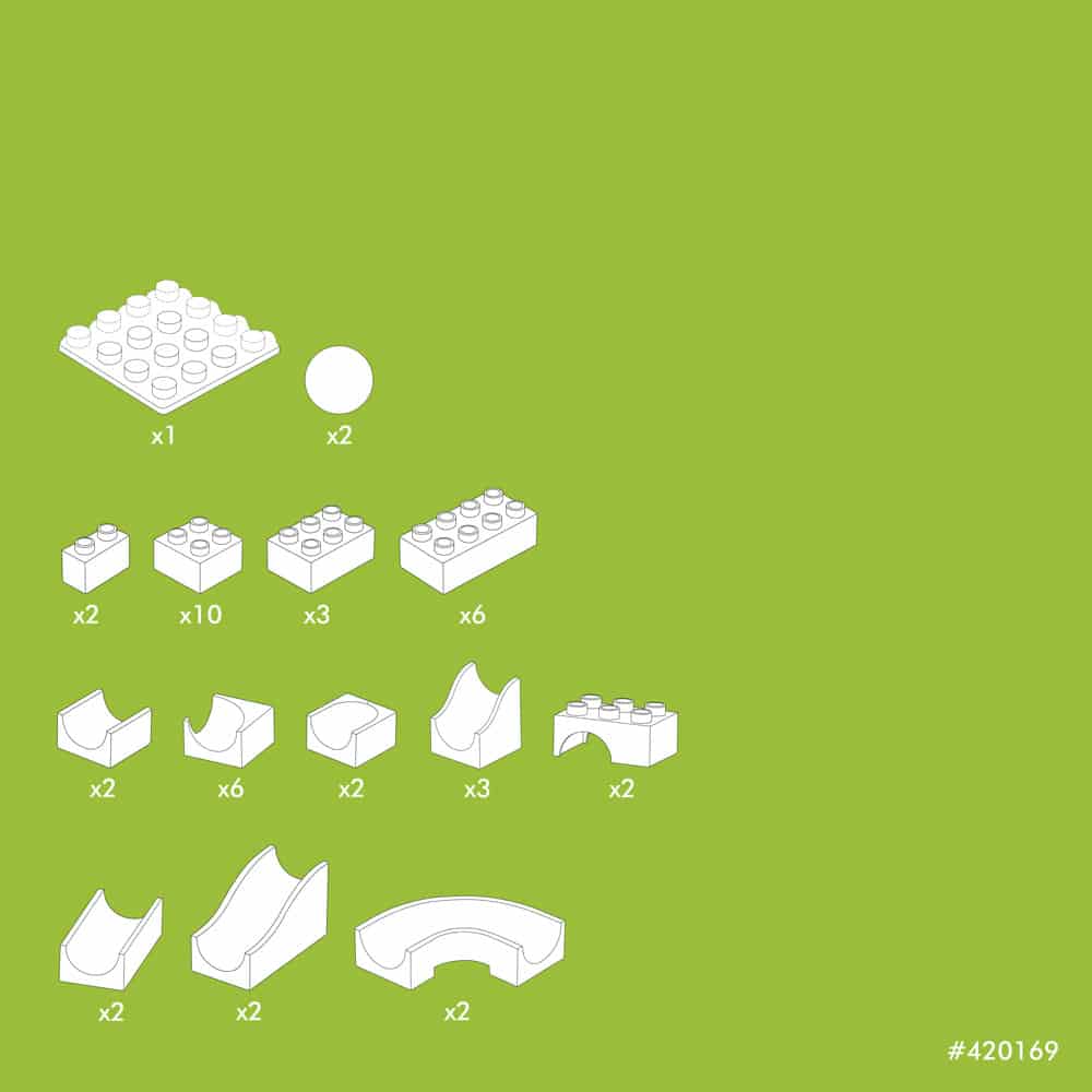 - 45 Teile (21 Bahnelemente, 21 Konstruktionsbausteine, 1 Grundplatte, 2 Kugeln) + Anleitungsheft