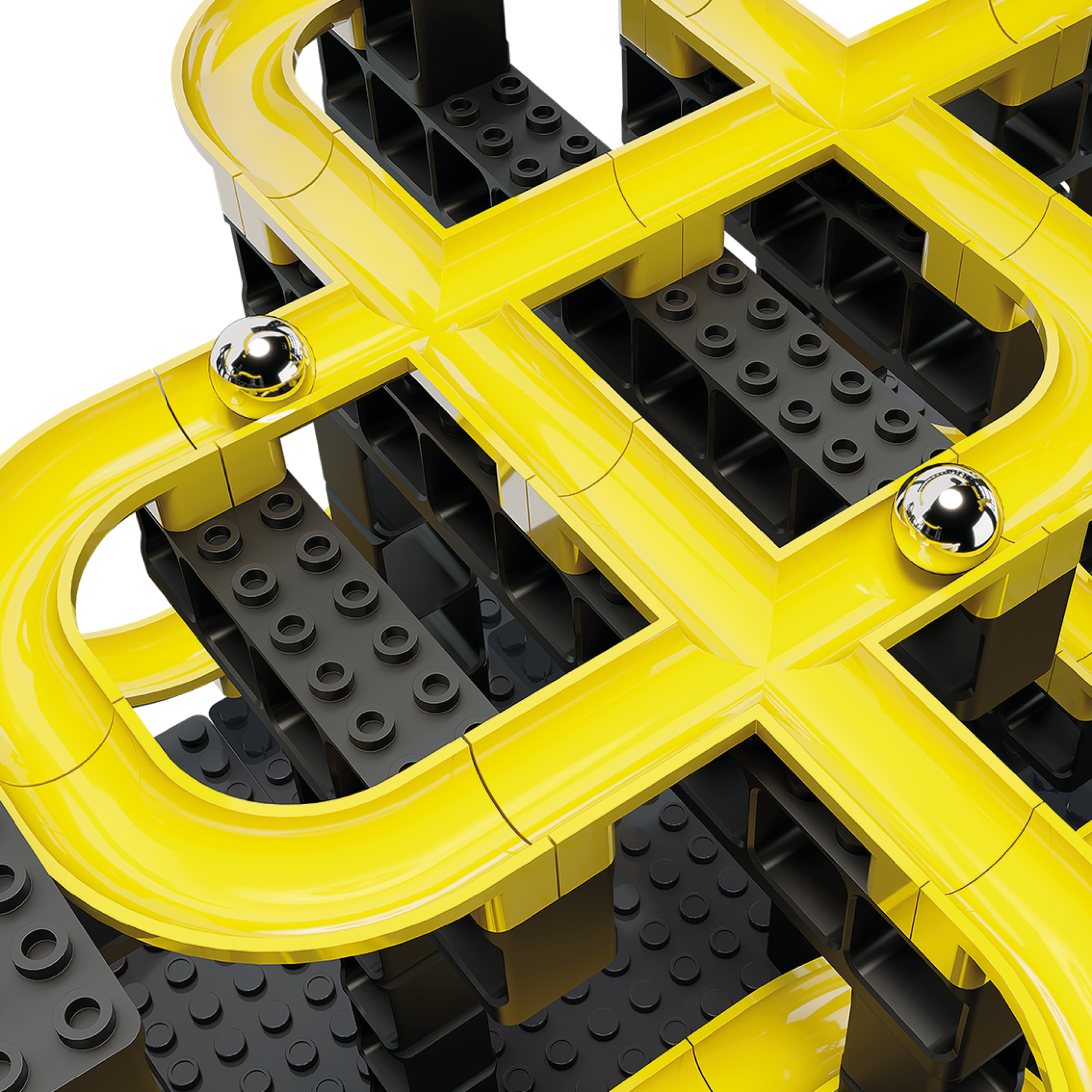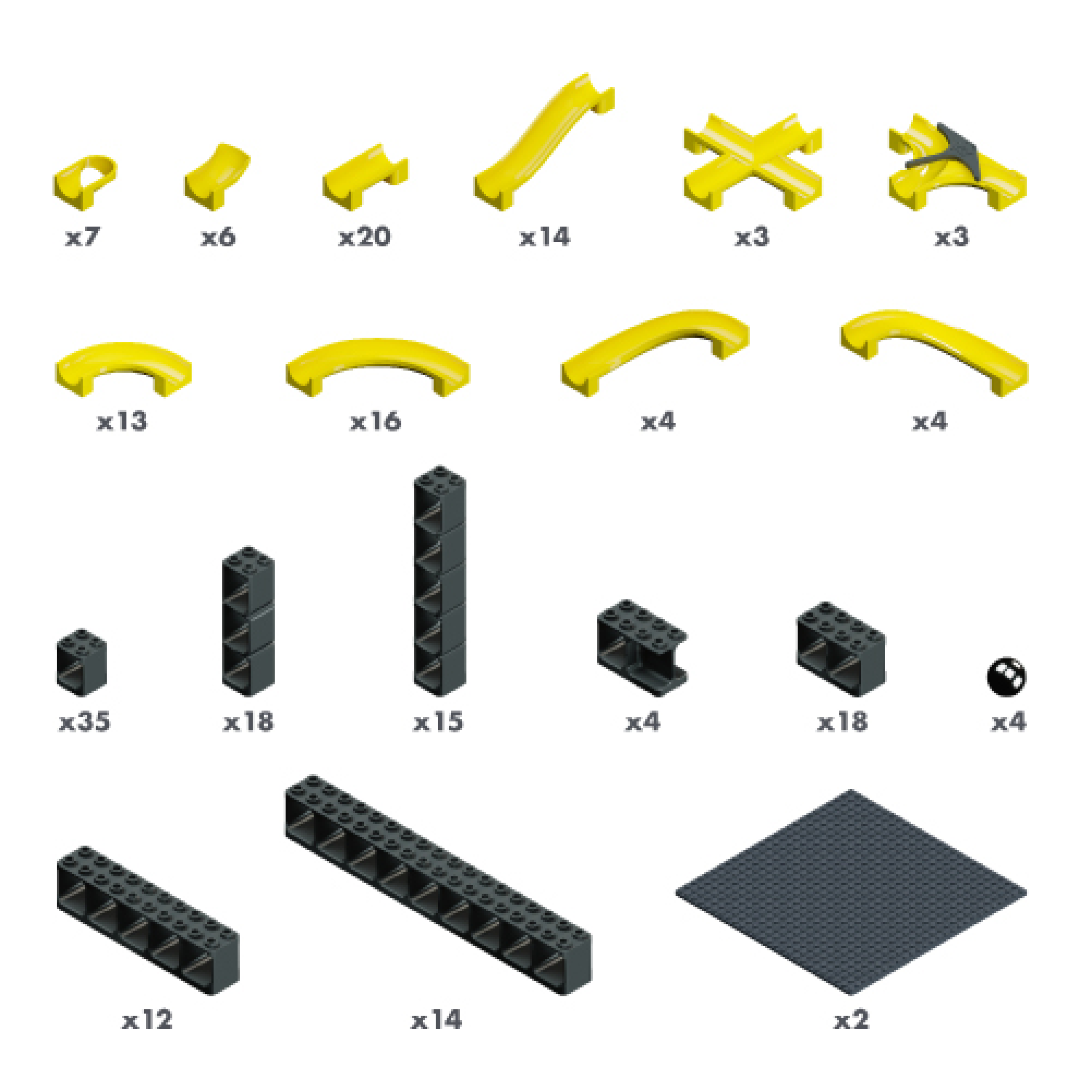 - 214 Teile (92 Bahnelemente, 116 Träger & Traversen, 2 Grundplatten und 4 Kugeln) + Anleitungsheft