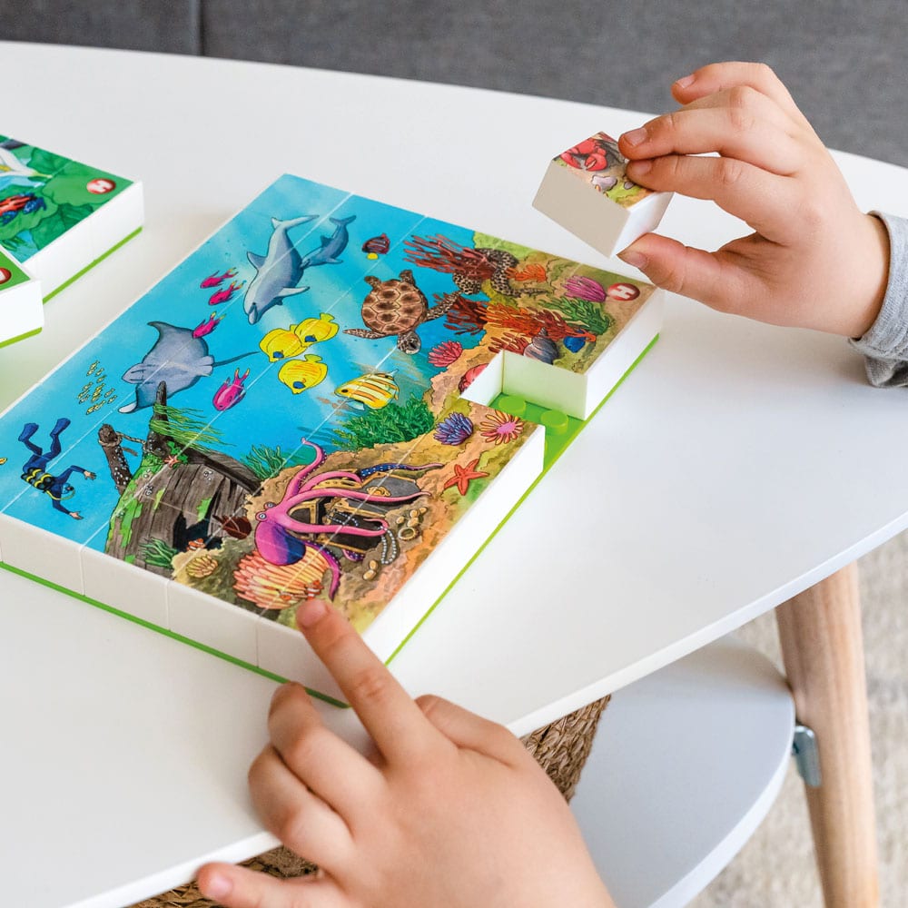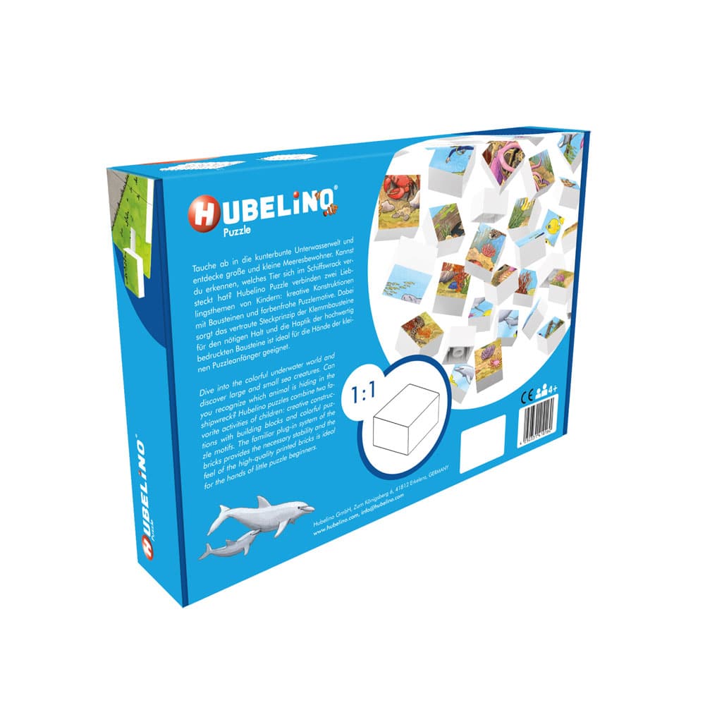 Tauche ab in die kunterbunte Unterwasserwelt und entdecke große und kleine Meeresbewohner. Kannst du erkennen, welches Tier sich im Schiffswrack versteckt hat? Hubelino Puzzle verbinden zwei Lieblingsthemen von Kindern: kreative Konstruktionen mit Bausteinen und farbenfrohe Puzzlemotive. Dabei sorgt das vertraute Steckprinzip der Klemmbausteine für den nötigen Halt und die Haptik der hochwertig bedruckten Bausteine ist ideal für die Hände der kleinen Puzzleanfänger geeignet.