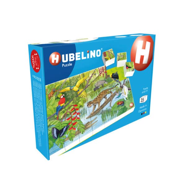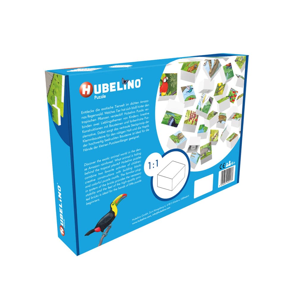 Entdecke die exotische Tierwelt im dichten Amazonas Regenwald. Welches Tier hat sich bloß hinter den tropischen Pflanzen versteckt? Hubelino Puzzle verbinden zwei Lieblingsthemen von Kindern: kreative Konstruktionen mit Bausteinen und farbenfrohe Puzzlemotive. Dabei sorgt das vertraute Steckprinzip der Klemmbausteine für den nötigen Halt und die Haptik der hochwertig bedruckten Bausteine ist ideal für die Hände der kleinen Puzzleanfänger geeignet.