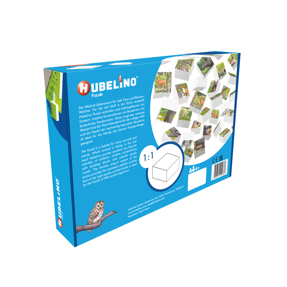 Der Wald ist Lebensraum für viele Tiere und Pflanzen. Welches Tier hat sich bloß in der Eiche versteckt? Hubelino Puzzle verbinden zwei Lieblingsthemen von Kindern: kreative Konstruktionen mit Bausteinen und farbenfrohe Puzzlemotive. Dabei sorgt das vertraute Steckprinzip der Klemmbausteine für den nötigen Halt und die Haptik der hochwertig bedruckten Bausteine ist ideal für die Hände der kleinen Puzzleanfänger geeignet.