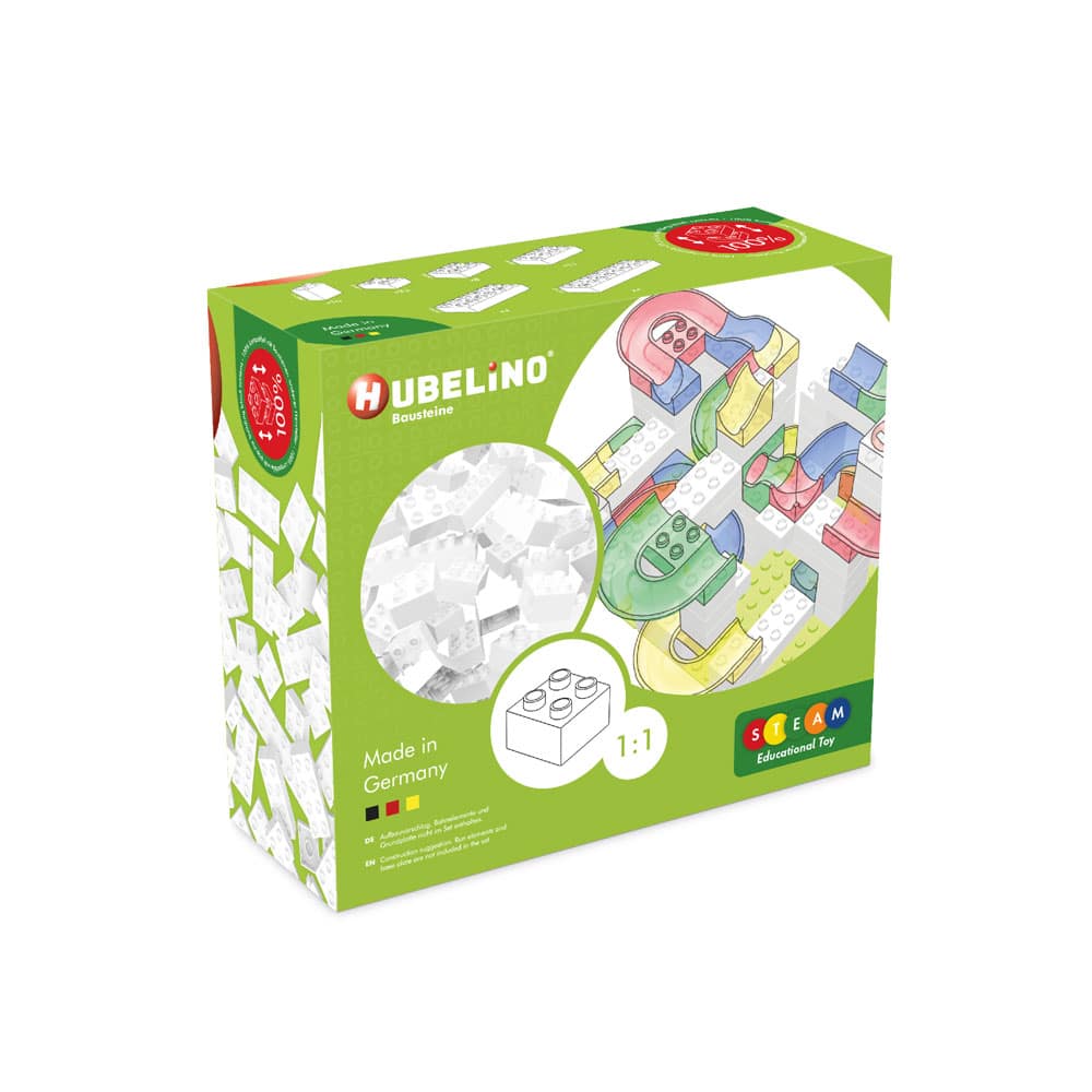Zubehör und Ersatzteile passend für das Hubelino Kugelbahn-System: Das Weiße Bausteine Set von Hubelino enthält 60 Bausteine in verschiedenen Größen und sorgt für den nötigen Halt in jeder Kugelbahn Konstruktion. Die Bausteine werden ausschließlich in Deutschland gefertigt und sind 100% kompatibel mit gängigen Baustein-Systemen anderer Hersteller.