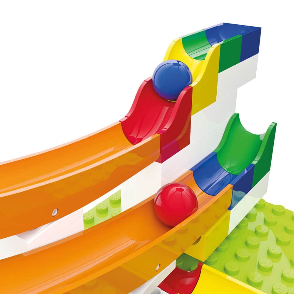 Mit der modularen und kompatiblen Kugelbahn, bei der nichts verwackelt oder verrutscht, werden räumliches Vorstellungsvermögen und erste physikalische Gesetze vermittelt. Egal ob mit oder ohne Bauanleitung, der farbenfrohe Aufbau schult das Einhalten von Reihenfolgen, regt das Arbeitsgedächtnis an und trainiert das analytische Denkvermögen. Und das beste daran ist, dass wir auf ein vorhandenes System aufbauen und so die Nutzungsdauer verlängern.