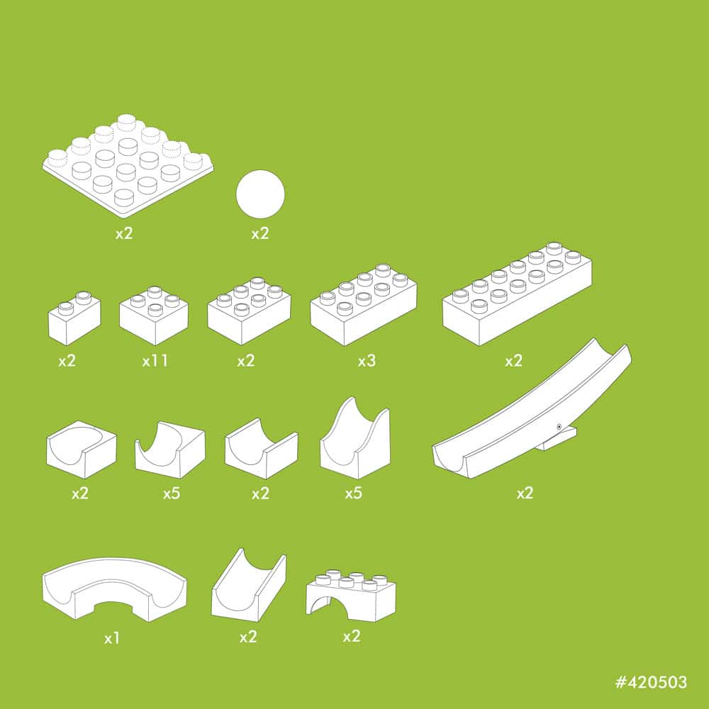- 45 Teile (19 Bahnelemente, 20 Konstruktionsbausteine, 2 Grundplatten, 2 Kugeln und 2 Wippen) + Anleitungsheft