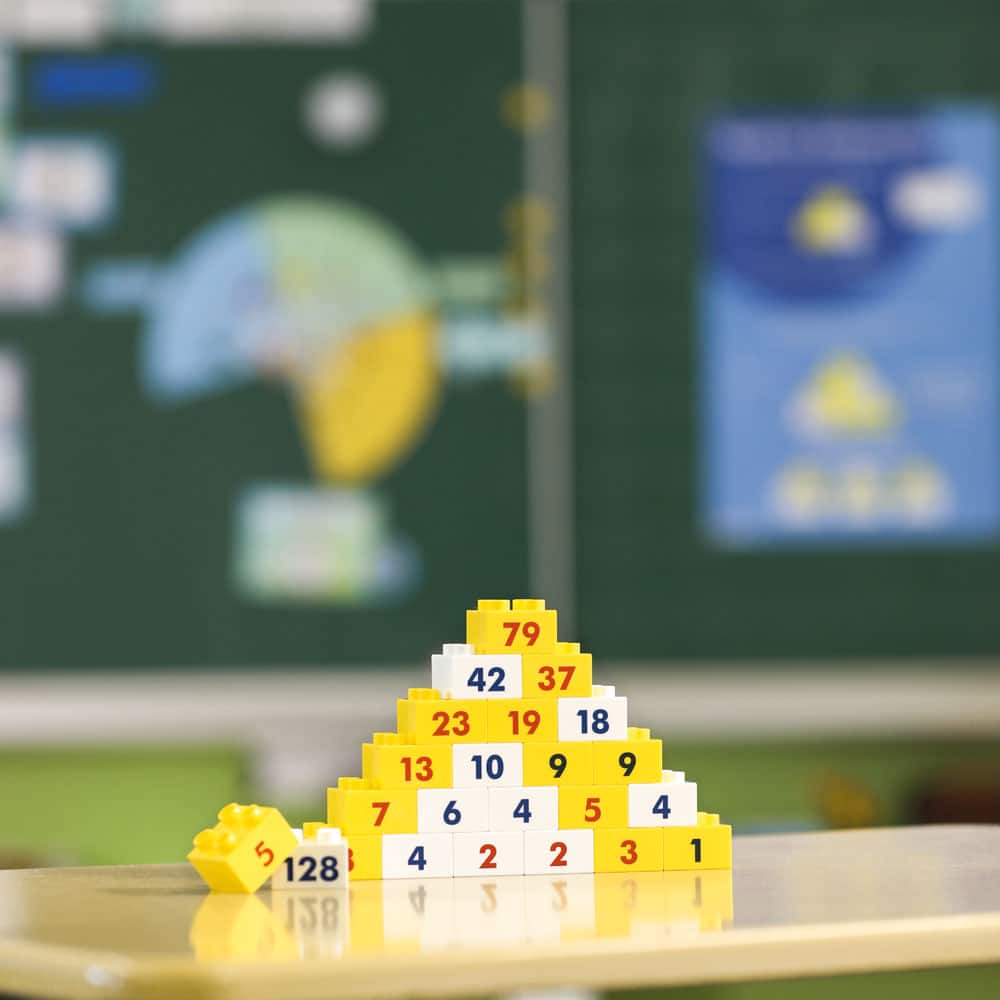 Mit Prof. Kortenkamps Mathe-Bausteinen können Grundschülerinnen und Grundschüler echte Zahlenmauern bauen, die sie bislang nur auf Papier im Mathe-Heft kennen. Das Prinzip ist einfach: Die Zahlen von zwei nebeneinander steckenden Bausteinen ergeben addiert die Ergebniszahl auf dem darüber sitzenden Deckstein.